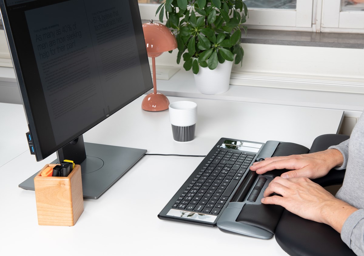Den centrerade placeringen av Mousetrapper framför tangentbordet ger en god ergonomisk arbetsställning med armarna nära kroppen och händerna nära tangentbordet.