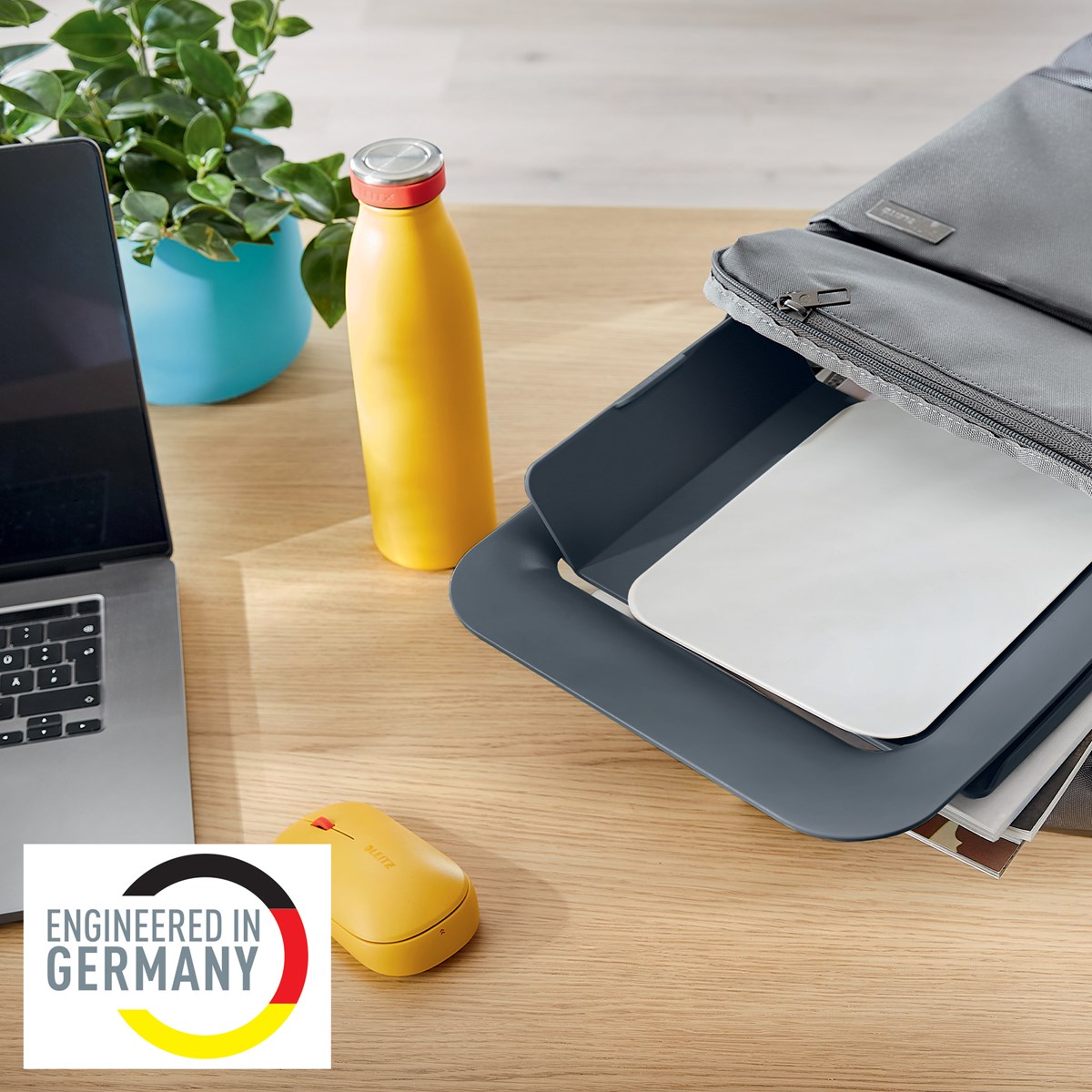 Leitz Ergo Cosy Laptopställ höjer skärmen på din bärbara dator för att öka din ögonkomfort och hjälpa till att förbättra din hållning. Tillverkad av 80% post-consumer återvunnen plast, produkten kan demonteras genom att metalldelar separeras från plast för 100% återvinning - hög kvalitet och lång livslängd för att hjälpa till att bevara jordens resurser. Att använda ett laptopställ främjar också luftflödet, vilket håller din laptops batteri och andra komponenter svala för att upprätthålla höga prestandanivåer. Med sin minimalistiska och färgglada design förbättrar det här eleganta laptopstativet både hälsa och välbefinnande genom att enkelt skapa den perfekta aktiva arbetsmiljön. Kombinera med andra Leitz Ergo-produkter för att skapa en inbjudande och flexibel arbetsplats som håller dig i rörelse hela dagen. Lämplig för bärbara datorer från 13" till 17", MacBooks som öppnas till maximalt 135 grader kan användas i höjdinställningarna 162 mm och 176 mm