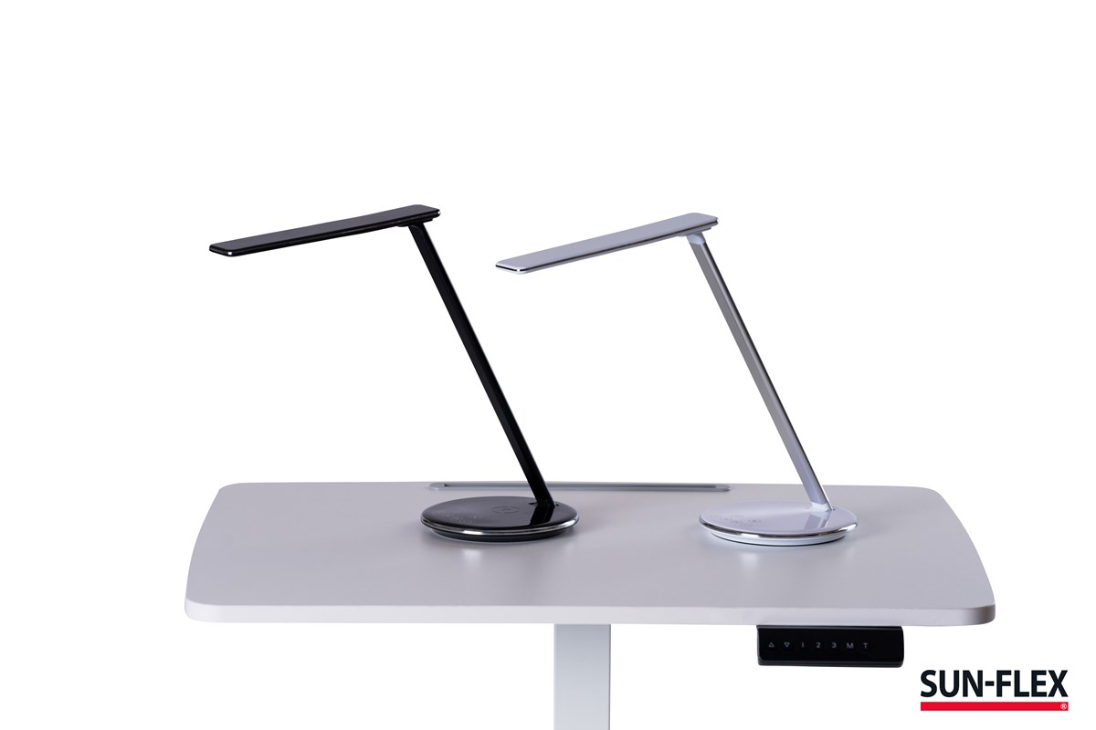 Stilren skrivbordslampa Trådlös laddning via QI Perfekt storlek för både kontor och hemmakontor Låg energiförbrukning Justerbar i både styrka och färgtemperatur