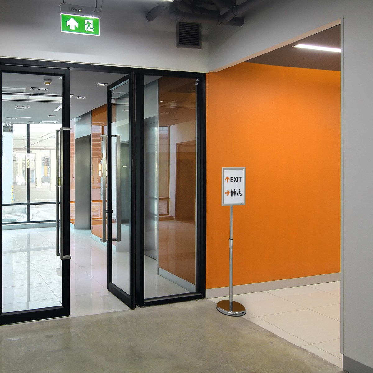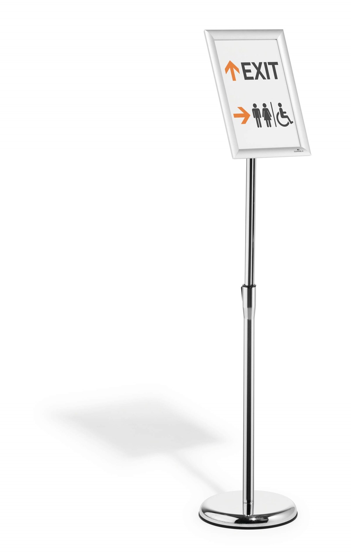 Skyltställ med snäppram och förkromat teleskopstativ som är stegvist justerbart från 77 till 120 cm (i stående A4). Mycket användbart på museer, utställningar, receptioner och andra ställen för att visa information som kan behöva bytas ut någon gång ibland. Byt inlaga genom att fälla upp alla 4 sidoprofiler och tag bort den UV-tåliga och antireflekterande plastfronten som skyddar inlagan. Ramen är gjord av en anodiserad aluminiumprofil, vilket gör aluminumytan mer hållbar. Informationsställets baksidan är av tålig polystyren. Justerbar läsvinkel och vridbar för att placeras i stående eller liggande format.