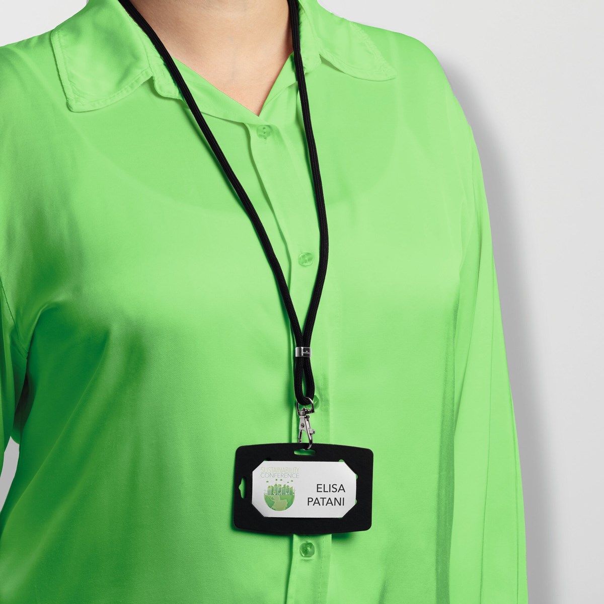 Rundvävt nyckelband av återvunnen PET med säkerhetslås som öppnas om man fastnar i något - en kombination av miljöfokus, funktionalitet och design. Roterbar karbinhake av metall. Textilhalsbandet används tillsammans med korthållare för passerkort, namnskyltar med hål eller nycklar. Nyckelbandet består av 80% återvunnet material och är 100% återvinningsbar. Längd: 46 cm.