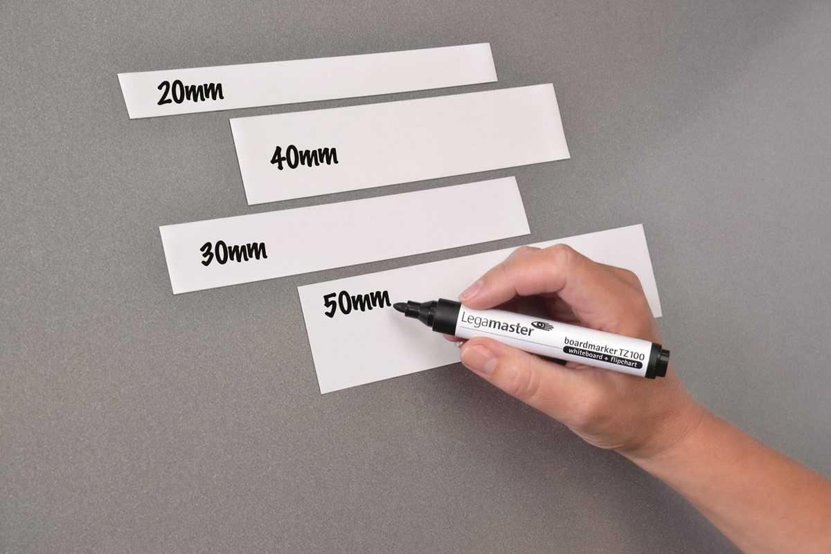 Magnetiska etikettband som fäster på alla järnhaltiga underlag. Banden har en vit skrivbar yta. Skrivbar med permanent märkpenna eller vanlig whiteboardpenna. Längd: 3 meter.