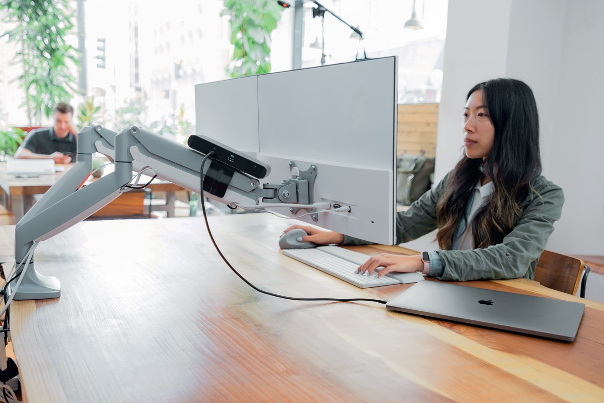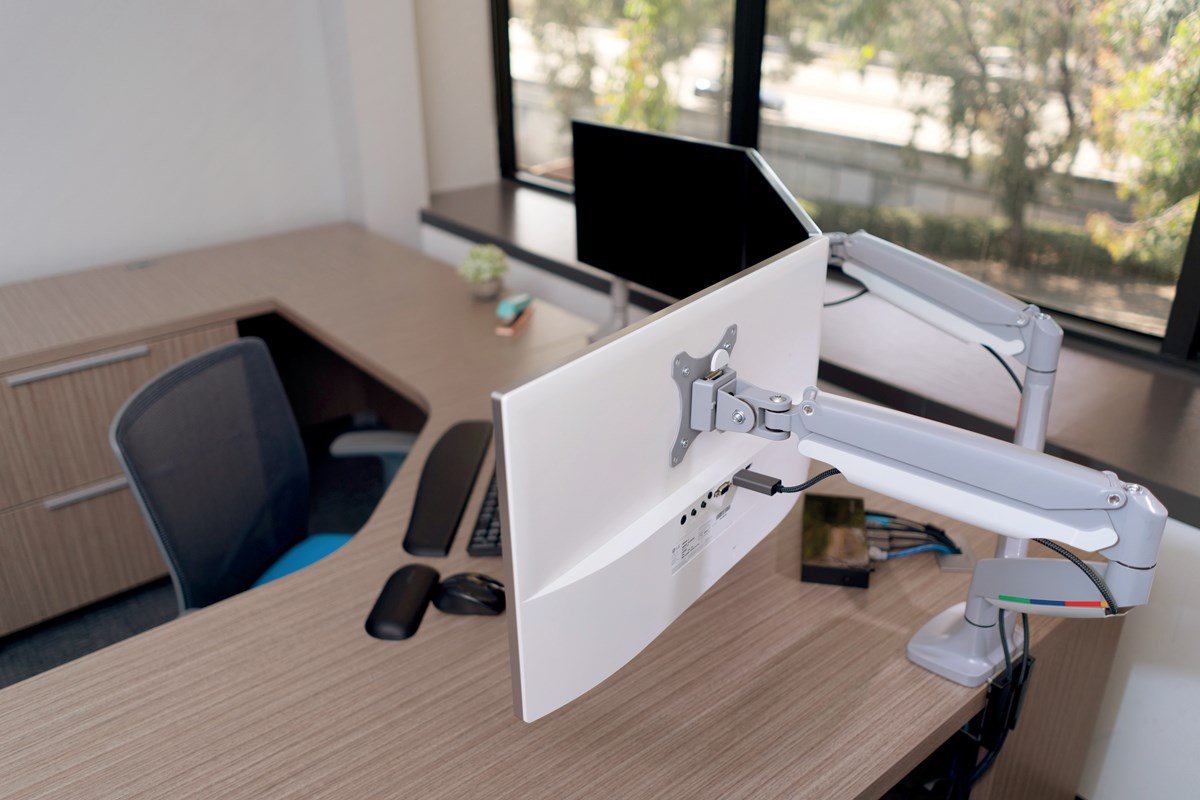 Lyfter skärmen på bekväm arbetshöjd och frigör plats på bordet. Monitorarm som är roterbar 180 grader. 90 graders lutningsjustering. Gasfjädring gör att armen enkelt justeras i höjdled med ett enhandsgrepp. Avtagbar VESA-platta för platta eller böjda bildskärmar på 13–32 tum. Max 9 kg/arm.