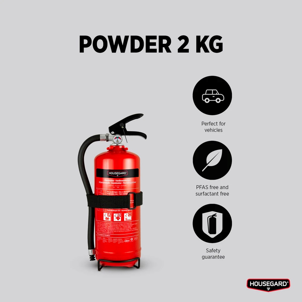 Med en 2 kg pulversläckare från Housegard i bilen kör du lite tryggare på vägen. Släckeffekten är på 13A 89B C vilket är den högsta på marknaden i storleksklassen vilket gör den väl anpassad för fordon som personbil, husvagn och fritidsbåt. Kan även användas som komplement till 6 kg pulversläckare i hemmet.