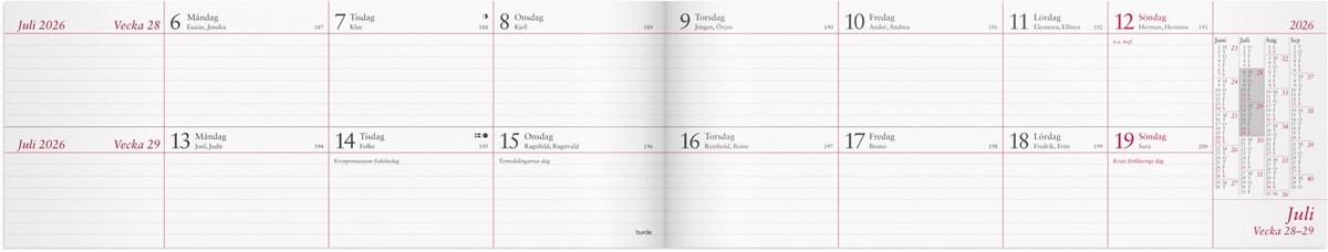 Format: 255x95 mm. Layout: Liggande. Två veckor/uppslag. Kalendarium: 2025-12-22 - 2027-01-03. Omslag: Kartong. Häftklamrad. Innehåll: Kyrkliga helgdagar, Flaggdagar, Helgdagar/aftnar, Månfaser, Namnsdagar, Internationella helgdagar översikt, Temadagar/händelser, Årsöversikt/årsöversikter, Årsplan/årsplaner. Antal sidor: 64. Miljöinformation: FSC®.
