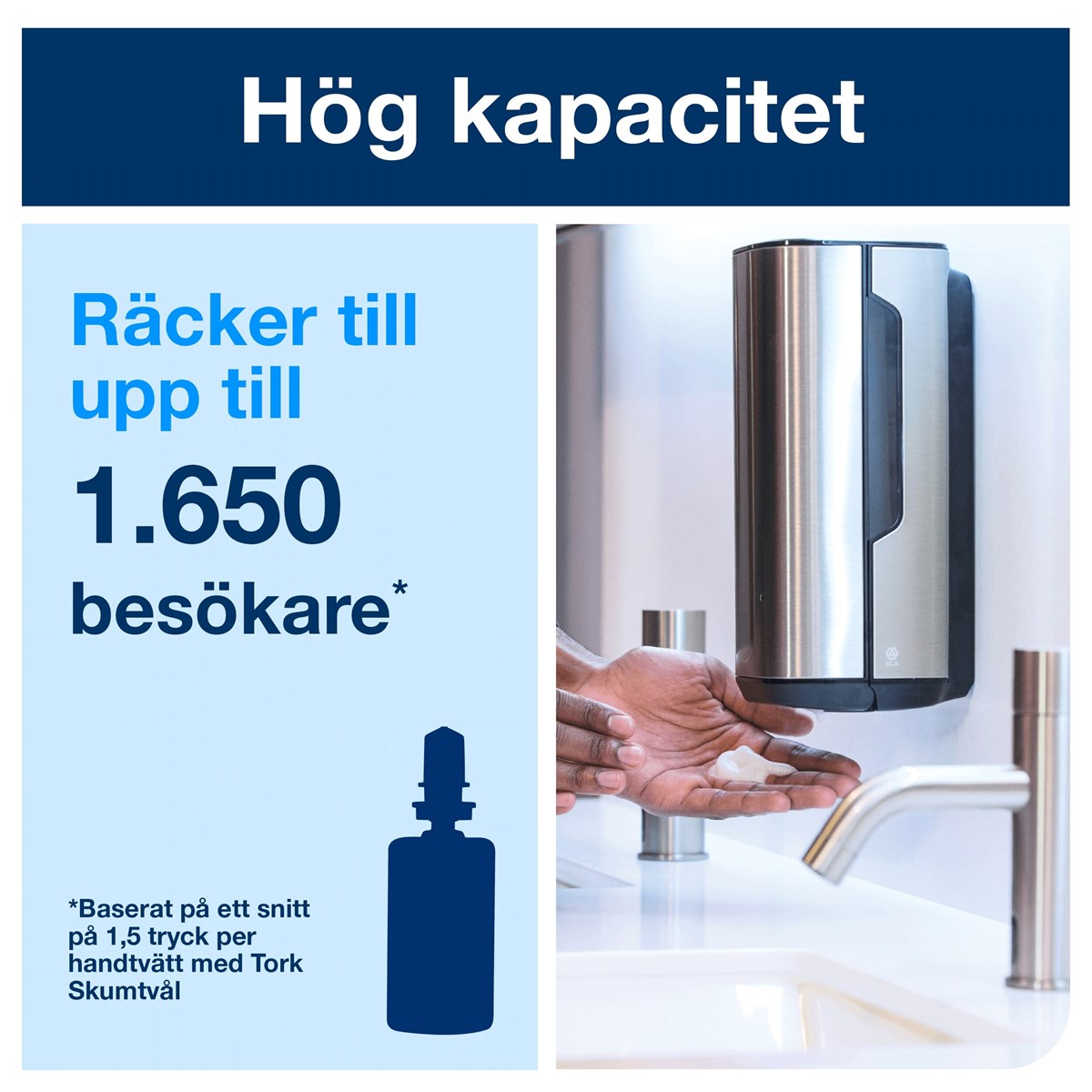 Beröringsfri, sensorstyrd hållare i rostfritt stål för Tork skumtvål. Hög kapacitet, en skumtvålsflaska ger 2500 doseringar. Hölje i lätt borstat rostfritt stål med skydd mot fingeravtryck ser snygg ut och förblir ren. Fönster på båda sidor för att man lätt ska kunna se när refillflaskan behöver bytas ut. Dokumenterat enkel att använda både för användare och städpersonal av Svenska Reumatikerförbundet. Mått: H27,8xB11,6xD13 cm. Drivs med 4 st LR14/typ C-batterier.