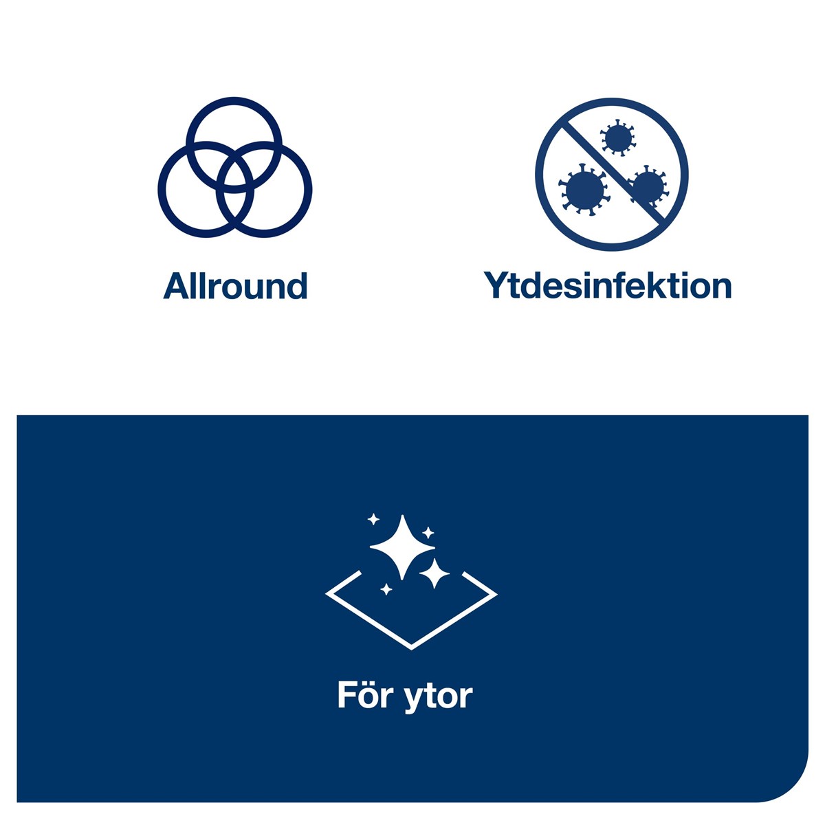 Tar död på 99,99 % av höljeförsedda virus inom 5 minuter Tar död på 99,99 % av bakterierna inom fem minuter Tar död på 99,9 % av jäst inom fem minuter Biologiskt nedbrytbar formula 100 % växtbaserade aktiva ingredienser (mjölksyra)