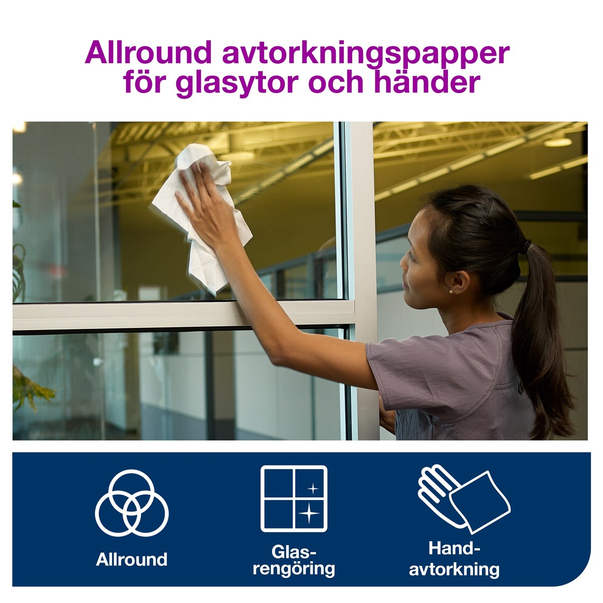 Vitt 1-lags allroundpapper för lättare avtorkning och för handavtorkning. Godkänt för livsmedelskontakt. Bredd 24,5 cm, längd 1000 m. 6,5 kg/rulle.