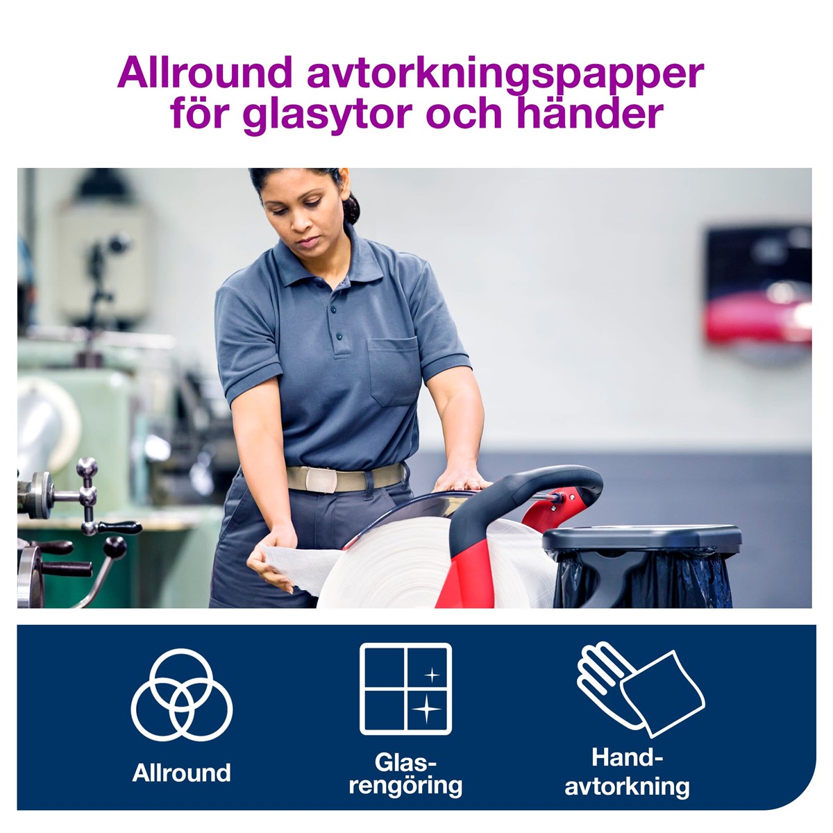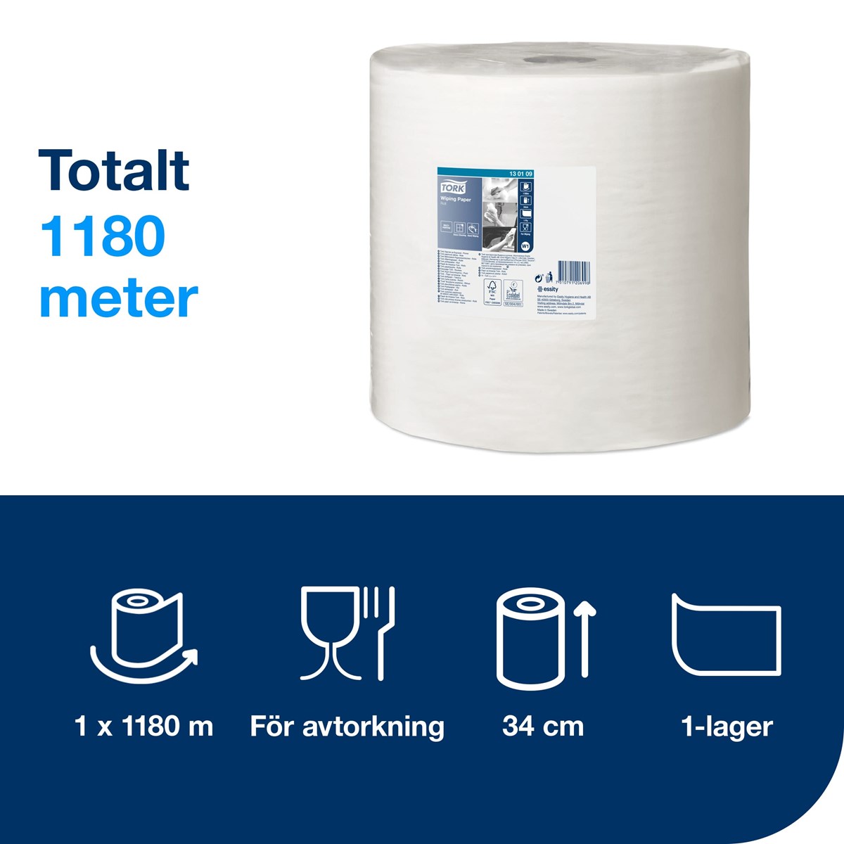 Vitt 1-lags allroundpapper för lättare avtorkning och för handavtorkning. Godkänt för livsmedelskontakt. Bredd 34 cm, längd 1180 m. 10,4 kg/rulle