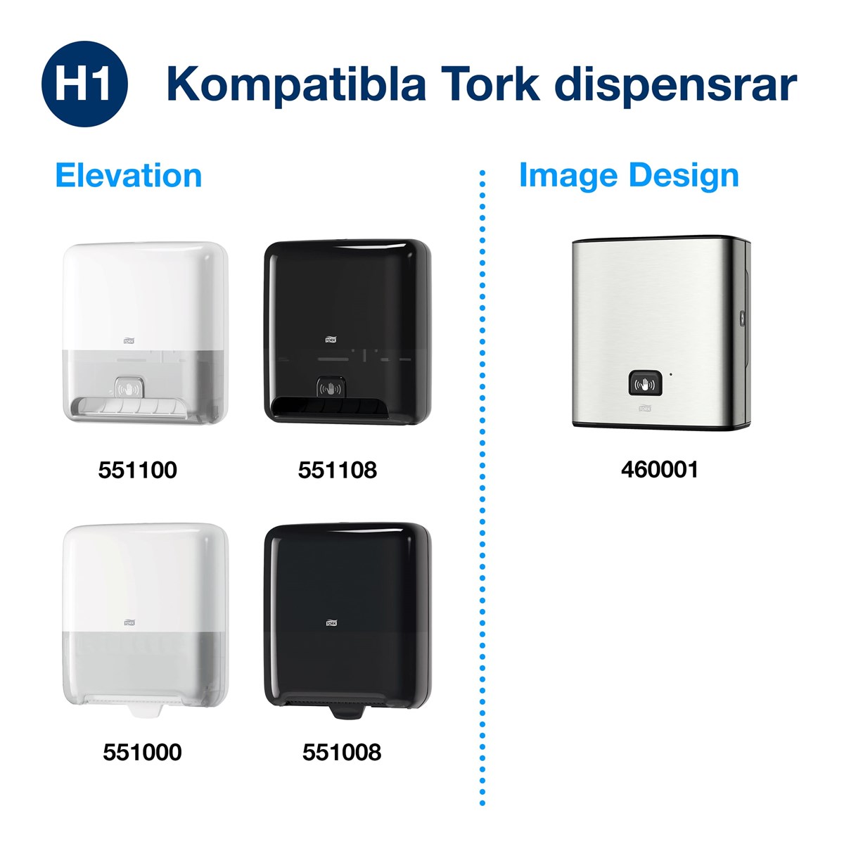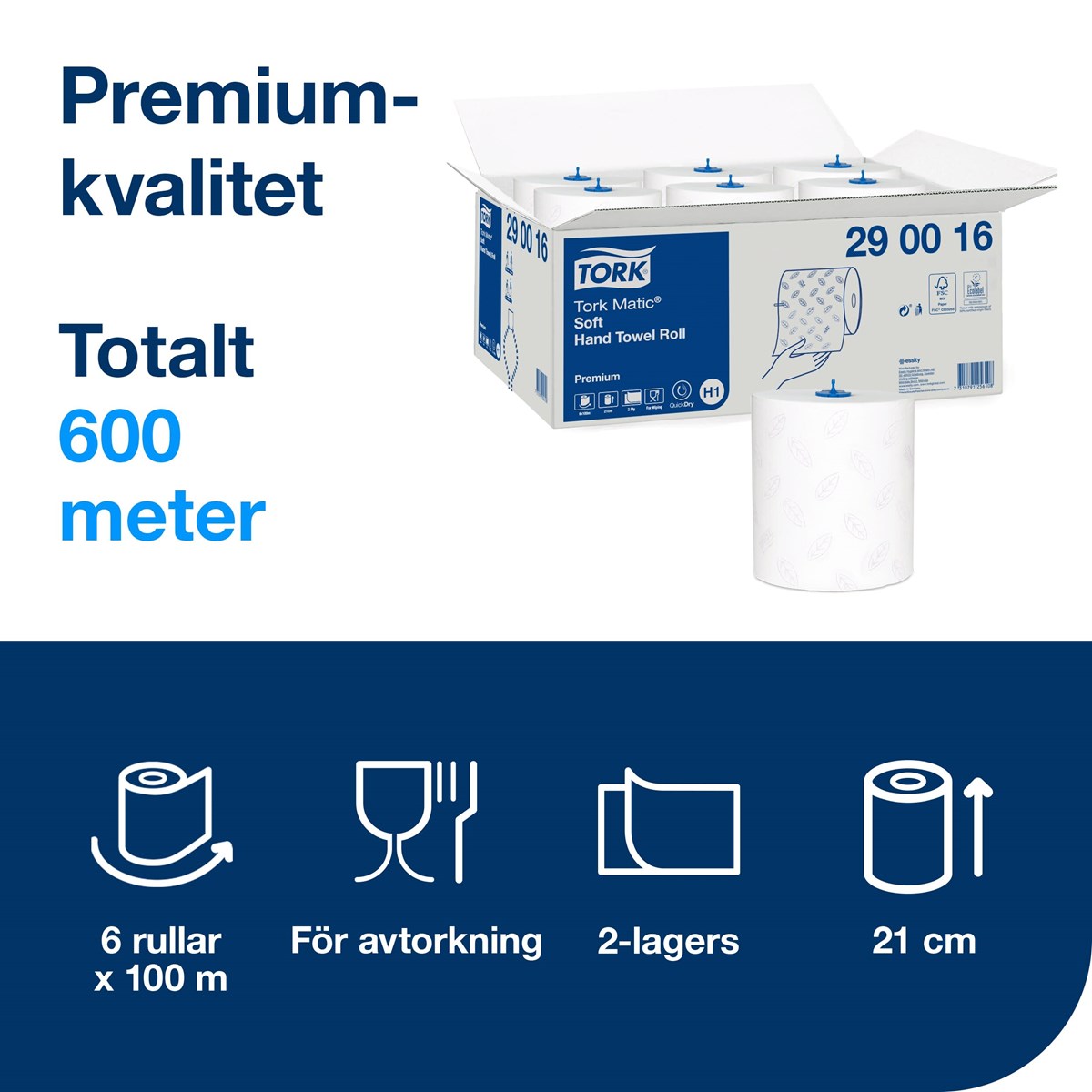 Extra mjuka hand dukar av högsta kvalitet (Premium). 2-lags vita artk med blå dekorprägling. Passar till handdukshållare Tork Matic H1. 100 m, 404 ark/rulle, 21 cm bred, 0,9 kg. 6 rullar/förp.